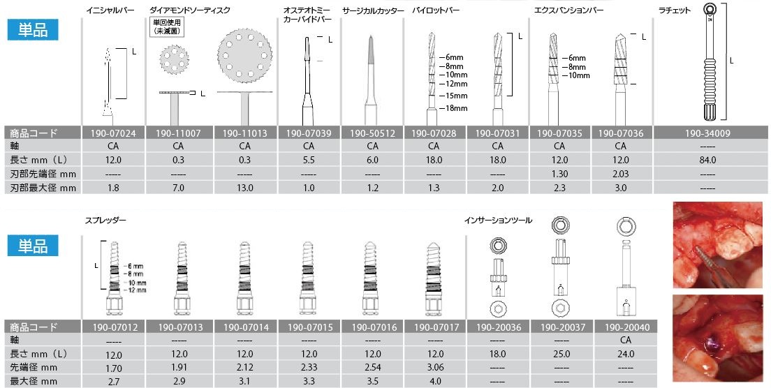 「スプリットコントロール12mm」は、骨ノミを用いた従来の術式に比べ、より低侵襲な処置を可能にします。 スクリュータイプのツールを用いることで、顎骨の水平的な幅径拡大(ボーンスプレッディング)をコントロール下で行うとともに、脆弱な骨を圧縮(ボーンコンデンス)して密度を高めることができます。