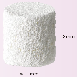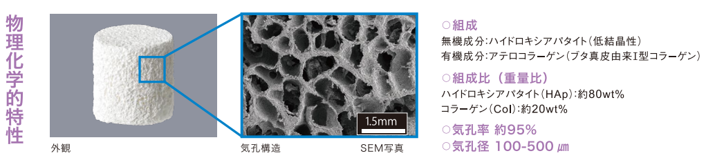 本品はハイドロキシアパタイト(低結晶性)とコラーゲン(ブタ真皮由来I型アテロコラーゲン)からなる多孔質体で、血液や生理食塩水などでの湿潤時にスポンジのような弾力性を有し、患部に隙間なくフィットすることができます。
