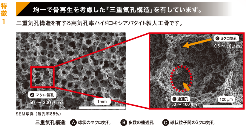 三重気孔構造(マクロ気孔・連通孔・ミクロ気孔)を有する超高気孔率(85%)のハイドロキシアパタイト製の人工骨です。